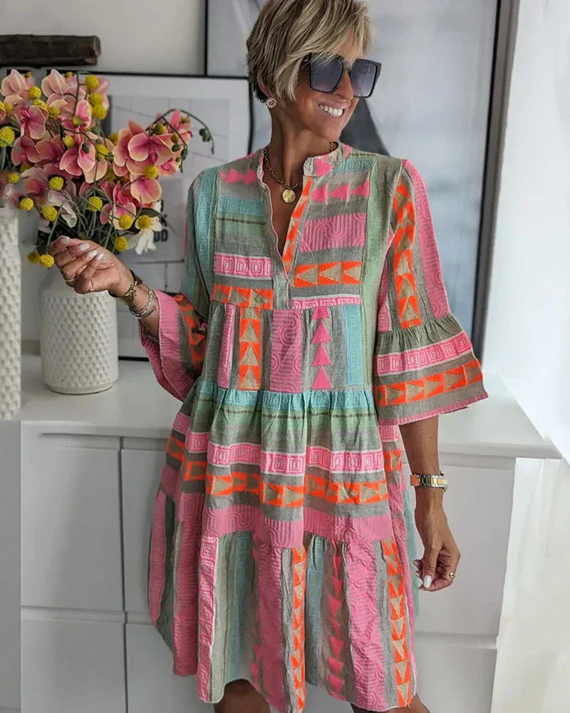 This vibrant tunic dress blends playful colour with effortless comfort. Its relaxed shape drapes beautifully, never clinging, while the lightweight fabric keeps you cool. Wide sleeves give gentle coverage, making it a piece made to give you confidence and ease, from sunny afternoons to evenings spent outdoors with family and friends.